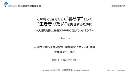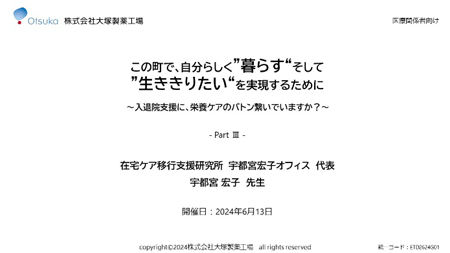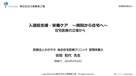 病院医療から、暮らしの場で支える医療を実現するために、食べる事(栄養療法が必要な事例)、最期まで自分らしく生きたいを支援した事例を題材に、患者さんが生活者として、地域の多職種と共にaging in placeを叶えるヒントをご紹介いただいております。