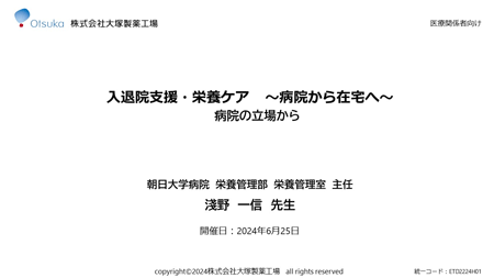 在宅医療と病院それぞれの立場から入退院支援・栄養ケアの継続について重要な視点や栄養情報提供書の活用など実践での具体的な事例をご紹介いただいております。