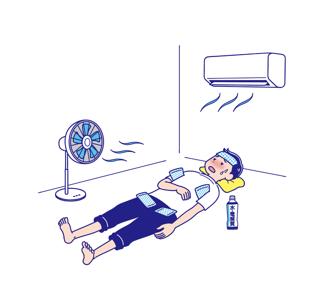 涼しい場所で身体を冷やして、水と塩分などの電解質を補給しましょう。