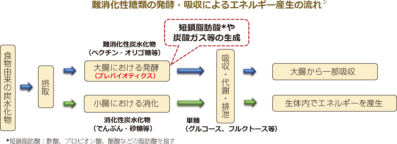 このうち短鎖脂肪酸のみが吸収され、エネルギーを産生する。