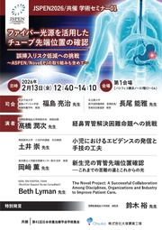 誤挿入リスク低減への挑戦 ~ASPEN Novel PJの取り組みも含めて~座長 福島 亮治 先生(帝京平成大学健康メディカル学部 健康栄養学科 教授) 長尾 能雅 先生(名古屋大学医学部附属病院 患者安全推進部 教授) 講演1 経鼻胃管解決困難命題への挑戦 髙橋 潤次 先生(国際医療福祉大学病院 外科 病院助教) 講演2 小児におけるエビデンスの発信と手技の工夫 土井 崇 先生(関西医科大学 小児外科講座 主任教授) 講演3 新生児の胃管先端位置確認―これまでの苦難の道とこれからの光 岡﨑 薫 先生(東京都立小児総合医療センター新生児科 部長) 講演4 The Novel Project:A Successful Collaboration Among Disciplines, Organizations and Industry to Improve Patient Care Beth Lyman 先生(MSN, RN FASPEN, FAAN(Nutrition Support Nurse Consultant)) -