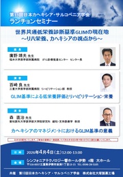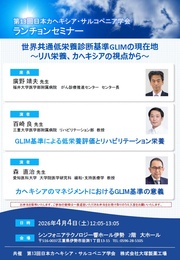 世界共通低栄養診断基準GLIMの現在地 ~リハ栄養、カヘキシアの視点から~座長 廣野 靖夫 先生(福井大学医学部附属病院 がん診療推進センター センター長) 講演1 GLIM基準による低栄養評価とリハビリテーション栄養 百崎 良 先生(三重大学医学部附属病院 リハビリテーション部 教授) 講演2 カヘキシアのマネジメントにおけるGLIM基準の意義 森 直治 先生(愛知医科大学医学部大学院研究科 緩和・支持医療学 教授) -