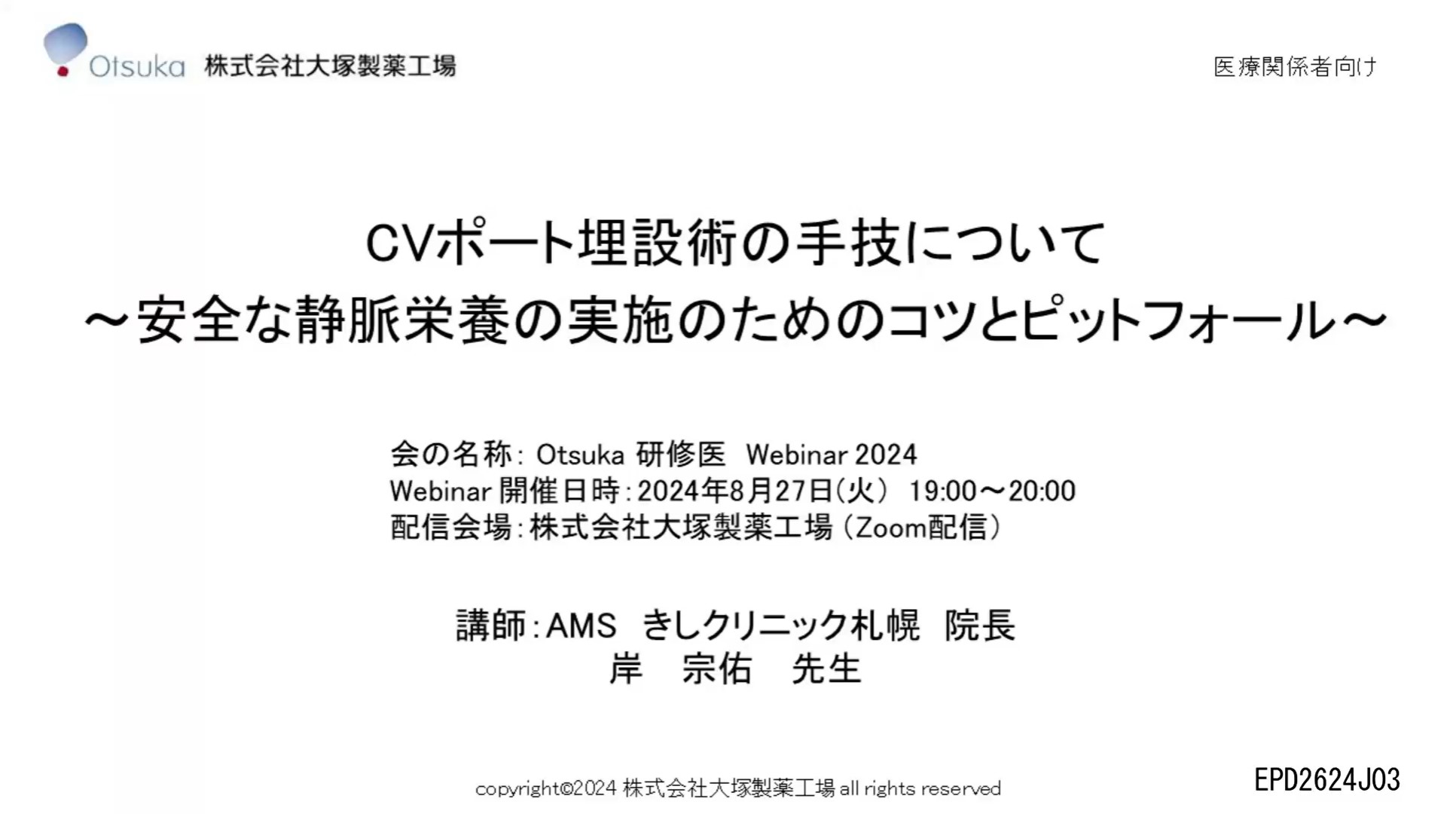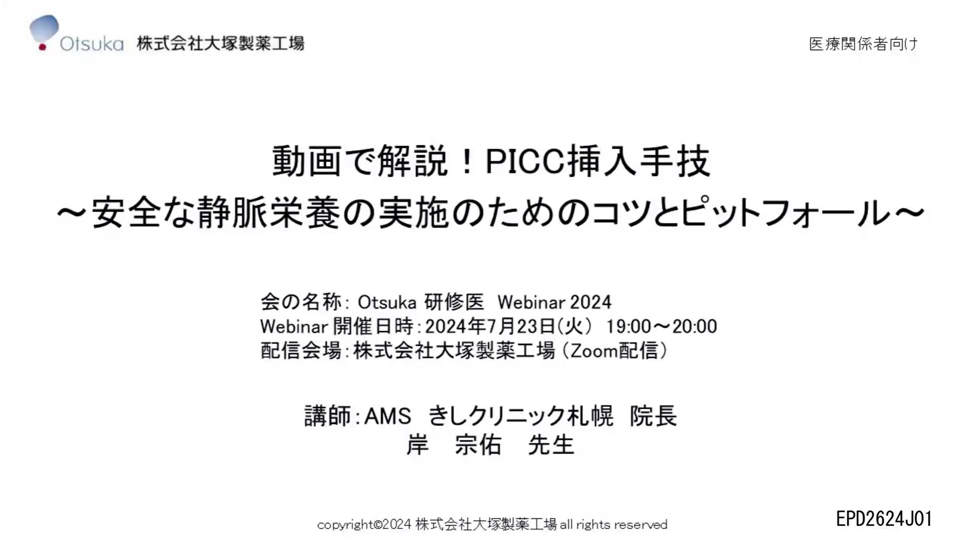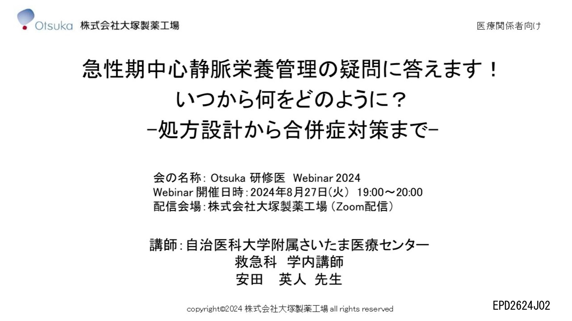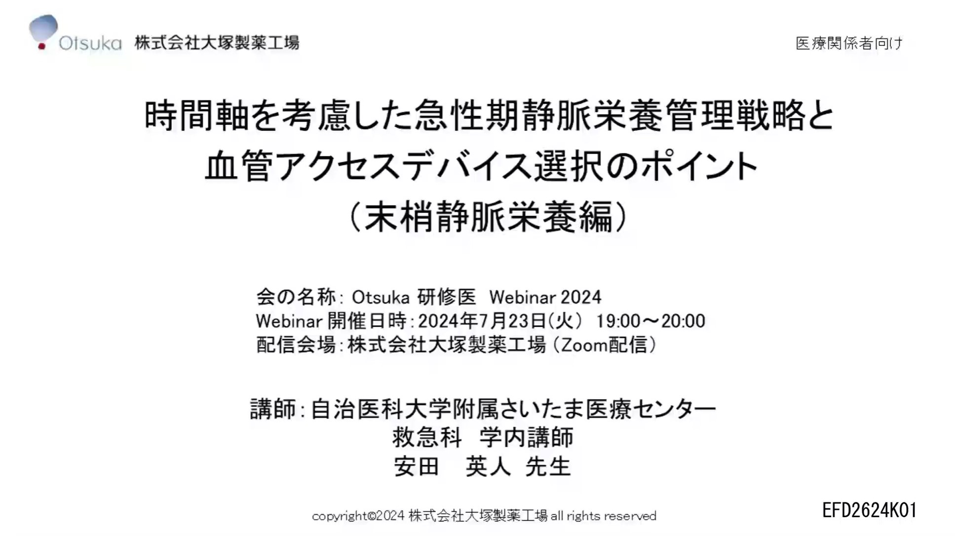 HOME 領域別情報 静脈栄養 研修医向けWEBセミナー(2024年収録) 第2回、第3回 研修医向けWEBセミナー(2024年収録) 第2回、第3回 29:12 第2回 part1時間軸を考慮した急性期静脈栄養管理戦略と血管アクセスデバイス選択のポイント(末梢静脈栄養編) [掲載日]2024/12/4 30:20 第2回 part2動画で解説!PICC挿入手技~安全な静脈栄養の実施のためのコツとピットフォール~ [掲載日]2024/12/4 26:43 第3回 part1急性期中心静脈栄養管理の疑問に答えます! いつから何をどのように?-処方設計から合併症対策まで- [掲載日]2024/12/4 29:21 第3回 part2CVポート埋設術の手技について~安全な静脈栄養の実施のためのコツとピットフォール~ [掲載日]2024/12/4 ⇒ 研修医向けWEBセミナー(2024年収録) 第1回はこちら