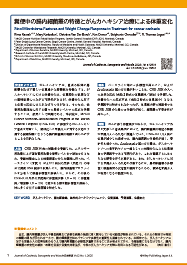 近年、腸内細菌叢ががんや慢性疾患など多様な疾患の発症に深く関与している可能性が報告されている。それらの報告では特定の菌種の関与が示される一方で、腸内細菌叢全体のバランスや多様性の重要性も指摘されている。本報告でも、がんカヘキシアに対する栄養介入の効果を高めるうえで腸内細菌叢の多様性が重要であることが示唆されており、予測指標となるだけでなく、腸内細菌叢の安定性の維持・改善を目指す栄養支持療法が、今後のがんカヘキシア対策に有用となる可能性がある。(奥川 喜永)