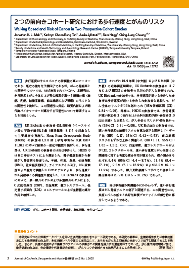 本研究は2つの大規模データベースを用いた多民族の前向きコホート研究である。本研究の結果は、主観的報告または客観的測定による歩行速度の向上が、身体活動レベルや握力とは独立して、あらゆるがんおよび肺癌の発症リスク低下と関連することを示した。さらに、炎症の低減および脂質プロファイルの改善がこの関連を媒介する潜在的因子であった。歩行量や持続時間に加え、歩行速度の向上は、免疫機能や代謝機能を改善し、がんリスクを低減させる効果があることを示唆した。(天野 晃滋)