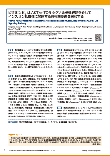 Vitamin K2 Alleviates Insulin Resistance Associated Skeletal Muscle Atrophy via the AKT/mTOR Signalling Pathwayサルコペニアと各種ビタミンの関係が報告されている中、本研究は血液凝固機能・骨代謝・心血管に対する作用などで知られているビタミンK₂ に、AKT/mTOR 経路を介した骨格筋萎縮抑制効果があることを明らかにした。ビタミンK₂ は安全性の高い栄養素とされており、日本では最も有名かつ効率よく摂取できる食品として納豆があり、日常においても簡便に実践できると考える。(橋本 善隆)