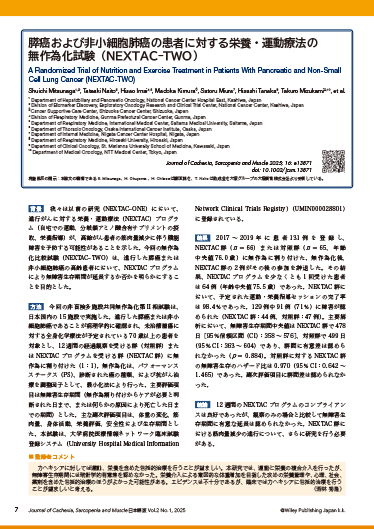 A Randomized Trial of Nutrition and Exercise Treatment in Patients With Pancreatic and Non-Small Cell Lung Cancer (NEXTAC-TWO)カヘキシアに対しては運動、栄養を含めた包括的治療を行うことが望ましい。本研究では、運動と栄養の複合介入を行ったが、無障害生存期間には統計学的有意差を認めなかった。栄養介入による意図的な体重増加を目指した攻めの栄養管理や、心理、社会、薬剤を含めた包括的治療のほうがよかった可能性がある。エビデンスは不十分であるが、臨床ではカヘキシアに包括的治療を行うことが望ましいと考える。(若林 秀隆)