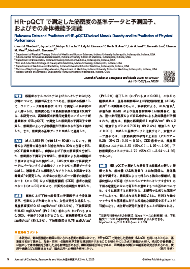 Reference Data and Predictors of HR-pQCT-Derived Muscle Density and Its Prediction of Physical Performance本研究は、骨格筋機能の評価に用いられる筋質の評価において、HR-pQCT で測定した筋密度(MusD)を用いるとともに、基準値を初めて提示し、加齢・性別・体脂肪率が主要な規定因子であることを明らかにした点で意義が大きい。MusD が骨筋量とは独立して身体機能を予測した点も新規性があるが、横断的解析が中心であり、因果関係の検証には縦断的研究が求められる。費用や被曝などの問題はあるが、臨床応用への展開を期待したい。(荒井 秀典)