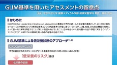 GLIM基準は3つの表現型基準と2つの病因基準の評価に基づいているが、人種、地域、また測定機器の有無によって画一的に解釈・評価することが難しい側面も有する。そこで、近年報告された筋肉量や炎症の評価に関するガイダンスも交えて、本邦でGLIM基準を用いる際の留意点を紹介する。