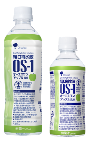 個別評価型病者用食品許可表示 オーエスワン アップル風味は、脱水症のための食事療法(経口補水療法)に用いる経口補水液です。軽度から中等度の脱水症における水・電解質の補給、維持に適した病者用食品です。下記の状態等を原因とした脱水症の悪化防止・回復、脱水症の回復後も下記の状態等における水・電解質の補給、維持にご利用ください。